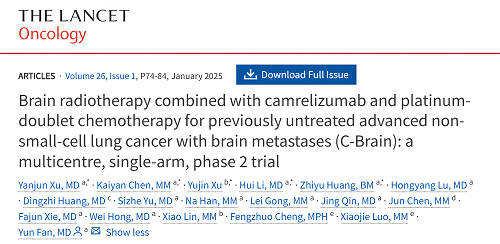 [1].Xu, Yanjun et al. Brain radiotherapy combined with camrelizumab and platinum-doublet chemotherapy for previously untreated advanced non-small-cell lung cancer with brain metastases (C-Brain): a multicentre, single-arm, phase 2 trial. The Lancet Oncology, Volume 26, Issue 1, 74 – 84.